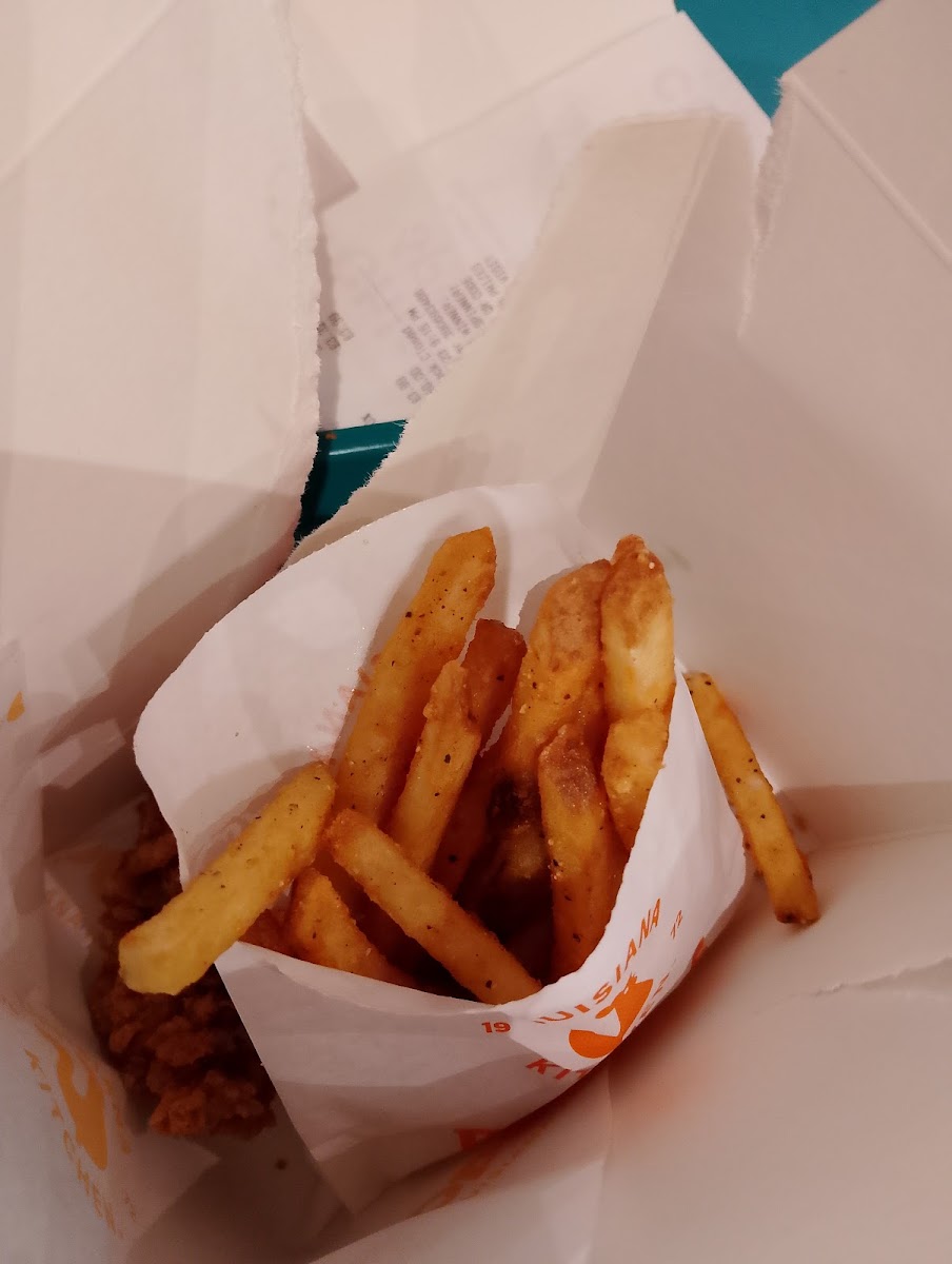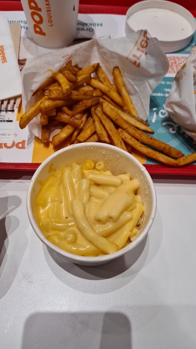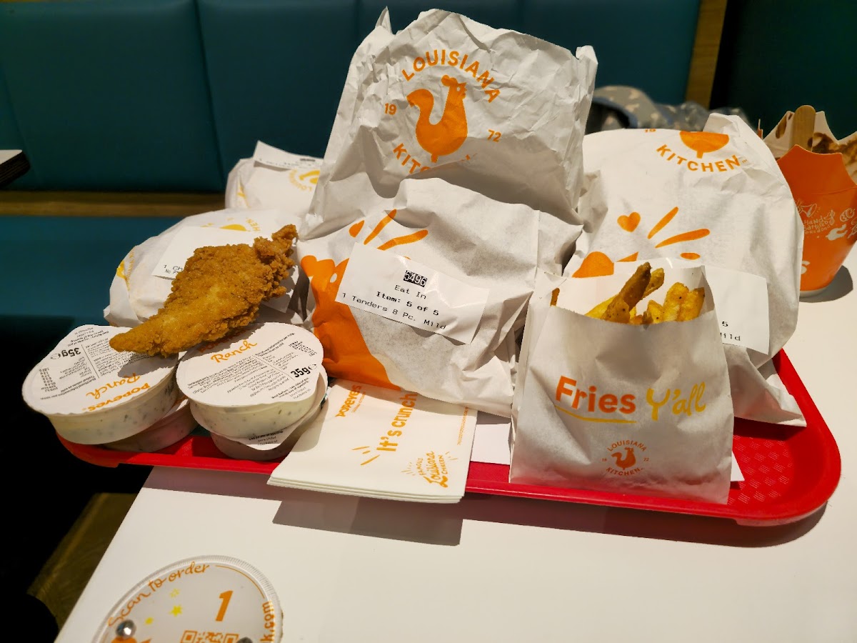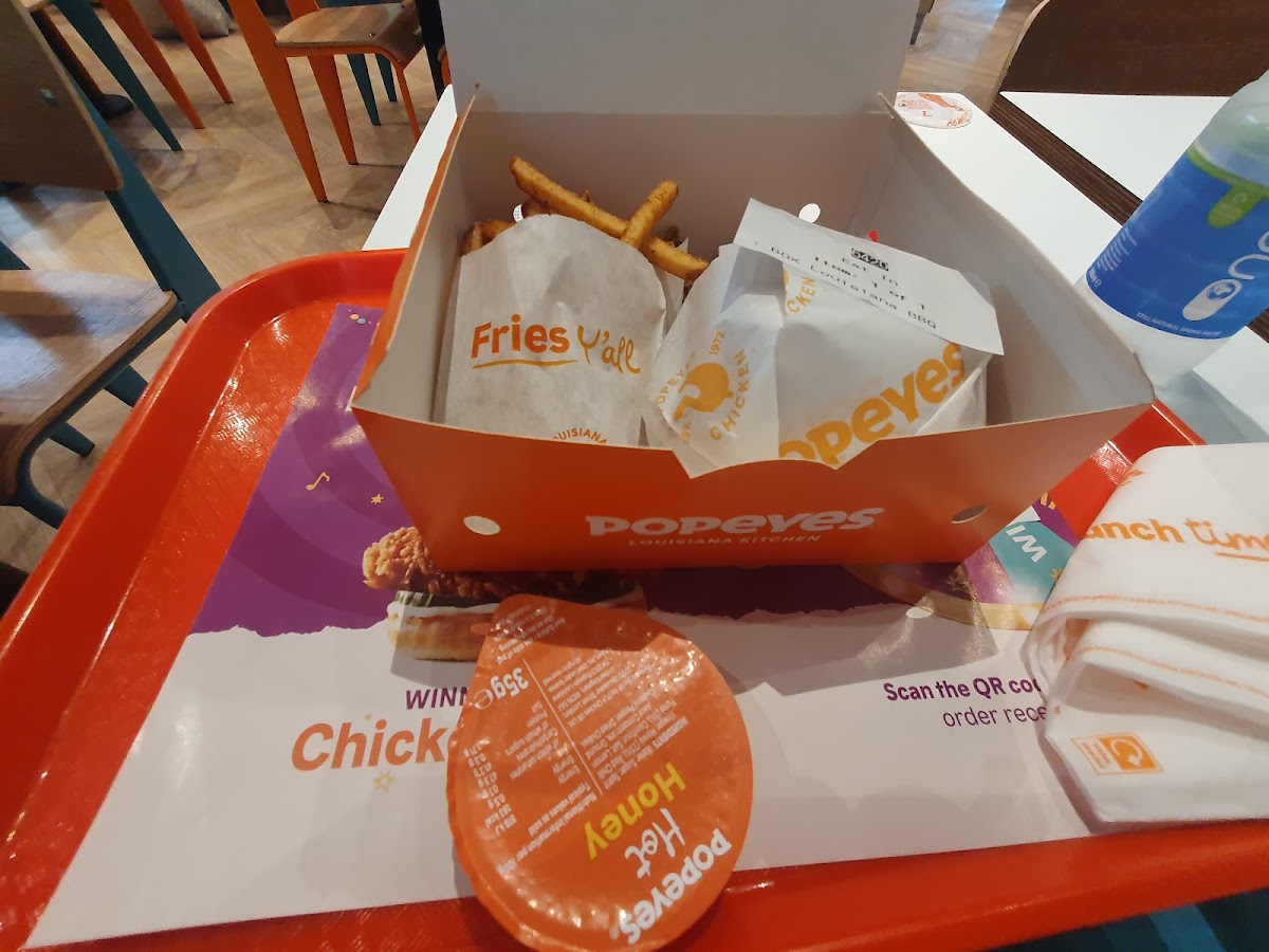 My first time at Popeye’s. We had to request for the table to be cleaned because it looked like the previous occupants were eating off the table! Even then, the “I-can’t-be-bothered-with-life-and-this-job” staff member just swished a supposedly clean rag over the table, throwing half of the mess on to my fiancée. We ordered a box meal each with 3 wings and cajun fries. The fries and wings were amazing. My burger on the other hand was awful. Someone explain to me why the cheese is translucent! I took 3 bites out of my burger and left the rest of it. I’m sure there is an explanation but somehow, charging THAT much for subpar food is daylight robbery, and to think we decided against KFC and thought to try a new place. Should have stayed with the tried and tested.